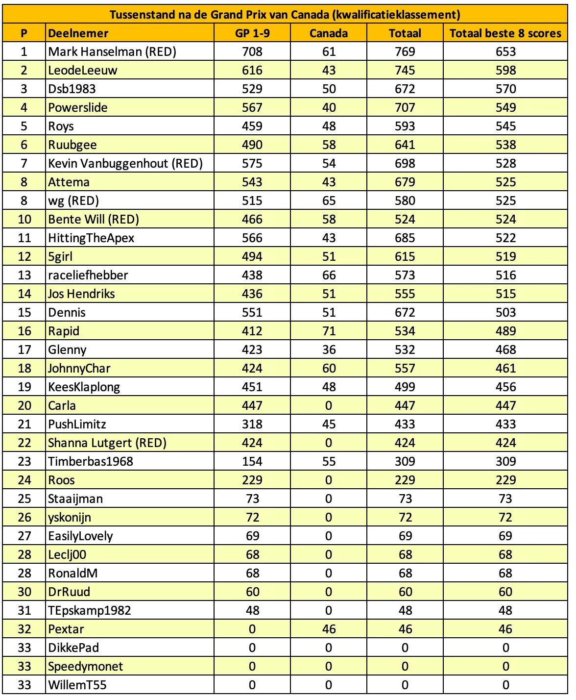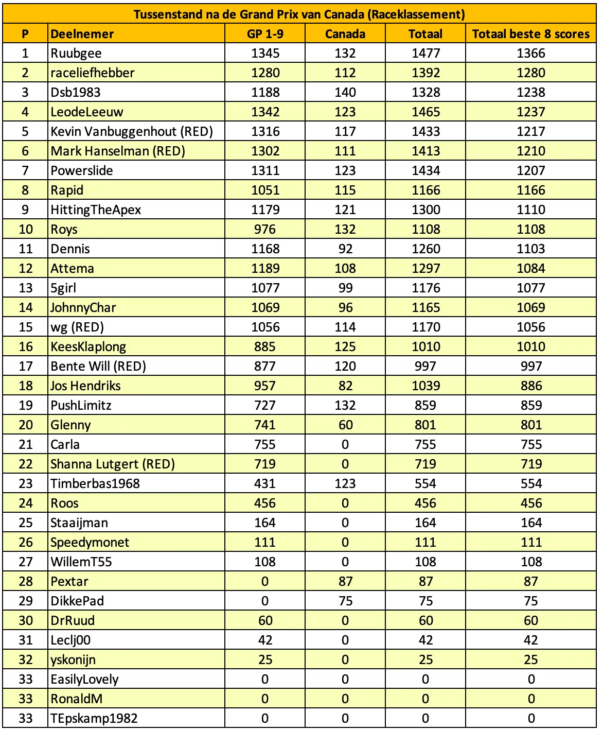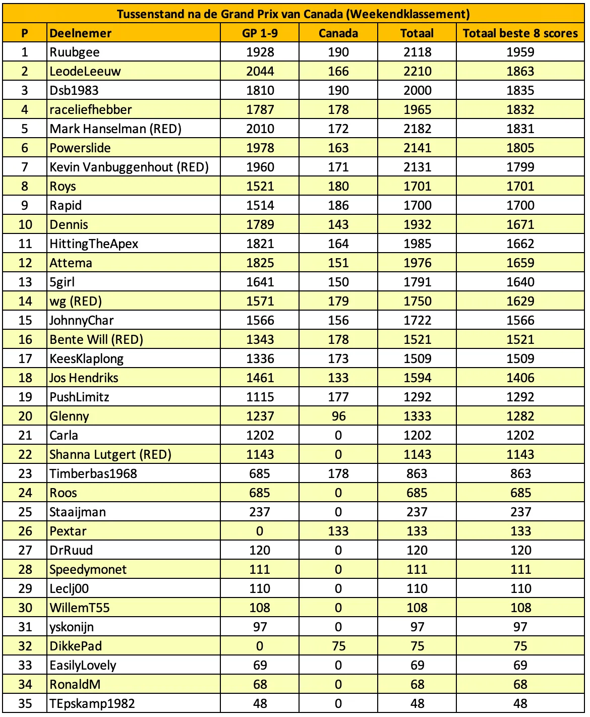 Dalam semua klasemen, kedua skor terlemah dalam sementara dihapus. Ini berkaitan dengan fakta bahwa hanya delapan belas akhir pekan terbaik yang dihitung sepanjang musim, sehingga memberi Anda kesempatan bahkan jika Anda sesekali melewatkan satu akhir pekan. Untuk mencegah tabel menjadi terlalu besar, sembilan akhir pekan pertama digabungkan ke dalam satu kolom. Skor per akhir pekan selalu dapat ditemukan di bawah artikel untuk akhir pekan tersebut (Anda dapat menggunakan ikon pencarian di situs web untuk ini). Artikel di mana prediksi untuk Grand Prix Austria dapat disampaikan akan tersedia pada hari Selasa, 24 Juni.