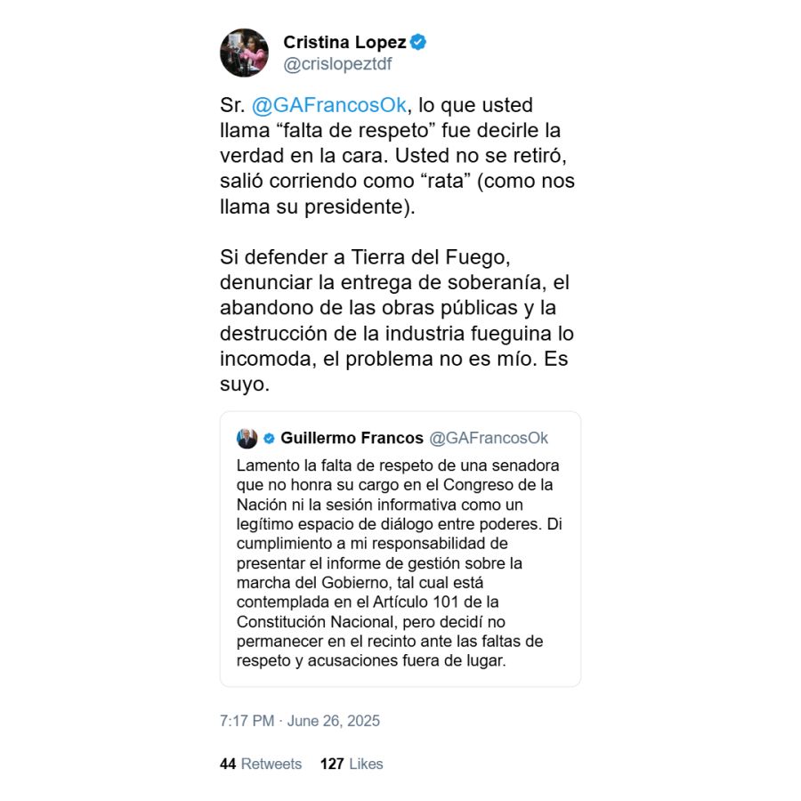 Selama partisipasinya dalam Radio Mitra Tanggung jawab yang ditimpakan Francos kepada legislator Tierra del Fuego atas kegagalan laporan tersebut adalah: " Dewan —maaf, senator— yang berbicara dengan cara itu merugikan bloknya sendiri. Tidak bisa memulai intervensi dengan mengatakan 'Anda adalah penipu'. Saya memintanya untuk memperbaiki diri, tetapi dia tidak melakukannya, jadi saya mengambil kertas-kertas saya dan pergi. ”.