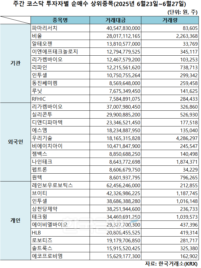 Instansi 'Farmarisearch', Asing 'Ligakemabio', dan Pribadi 'Rainbow Robotics' menduduki peringkat 1 [peringkat mingguan Kosdaq pembelian bersih - 23 Juni hingga 27 Juni 2025]