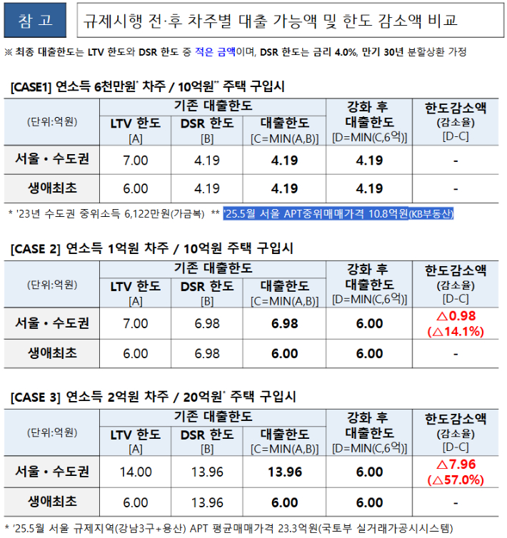 규제시행 전‧후 차주별 대출 가능액 및 한도 감소액 비교. 금융위원회 제공