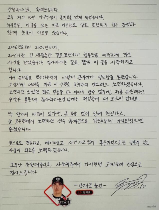 Hwang Jae-gyun, berusia 38 tahun, KT Wiz, yang memutuskan untuk pensiun setelah 20 tahun, berbagi perasaannya melalui surat tangan.