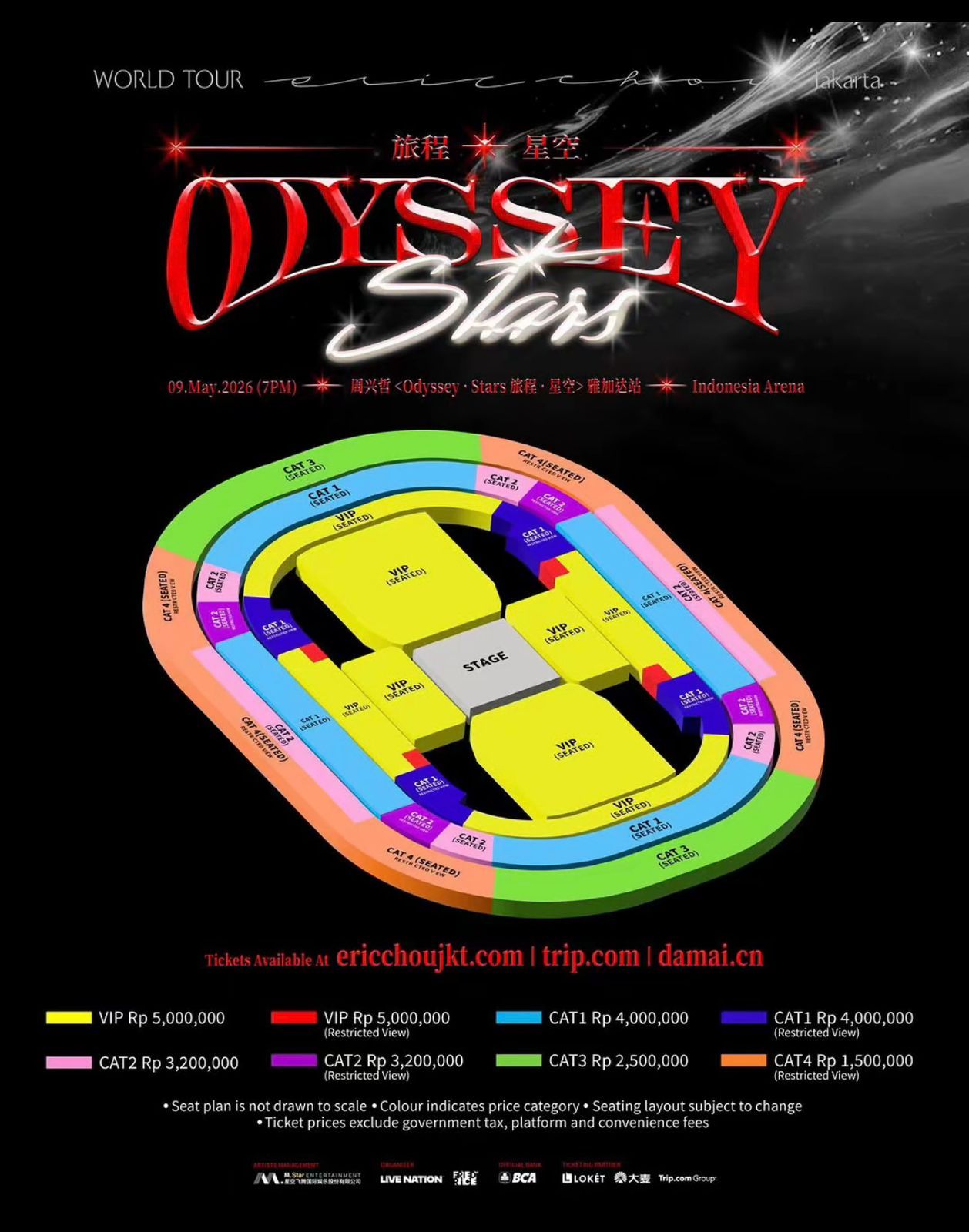 Berdasarkan poster resmi, tiket konser Eric Chou di Jakarta terbagi menjadi beberapa kelas dengan kisaran harga sebagai berikut: